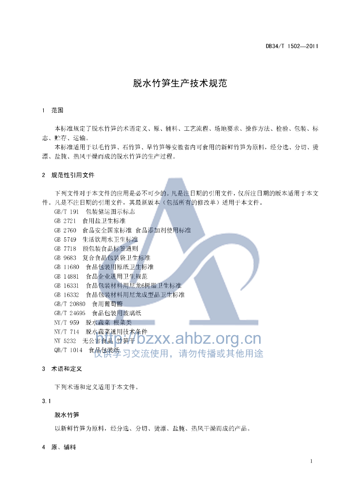 DB34/T 1502-2011 脱水竹笋生产技术规范