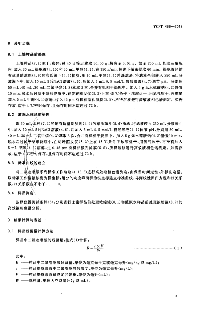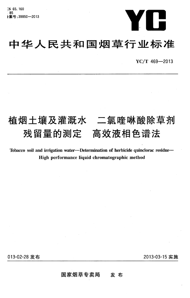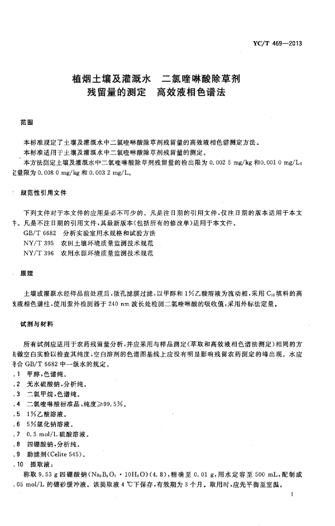 YC/T 469-2013 植烟土壤及灌溉水二氯喹啉酸除草剂残留量的测定 高效液相色谱法