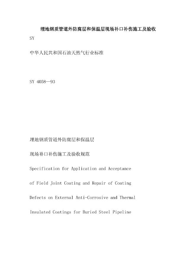 SY 4058-1993 埋地钢质管道外防腐层和保温层现场补口补伤施工及验收规范