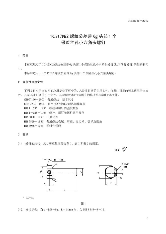 HB 8348-2013(2017) 1CR17Ni2螺纹公差带6G头部1个保险丝孔小六角头螺钉