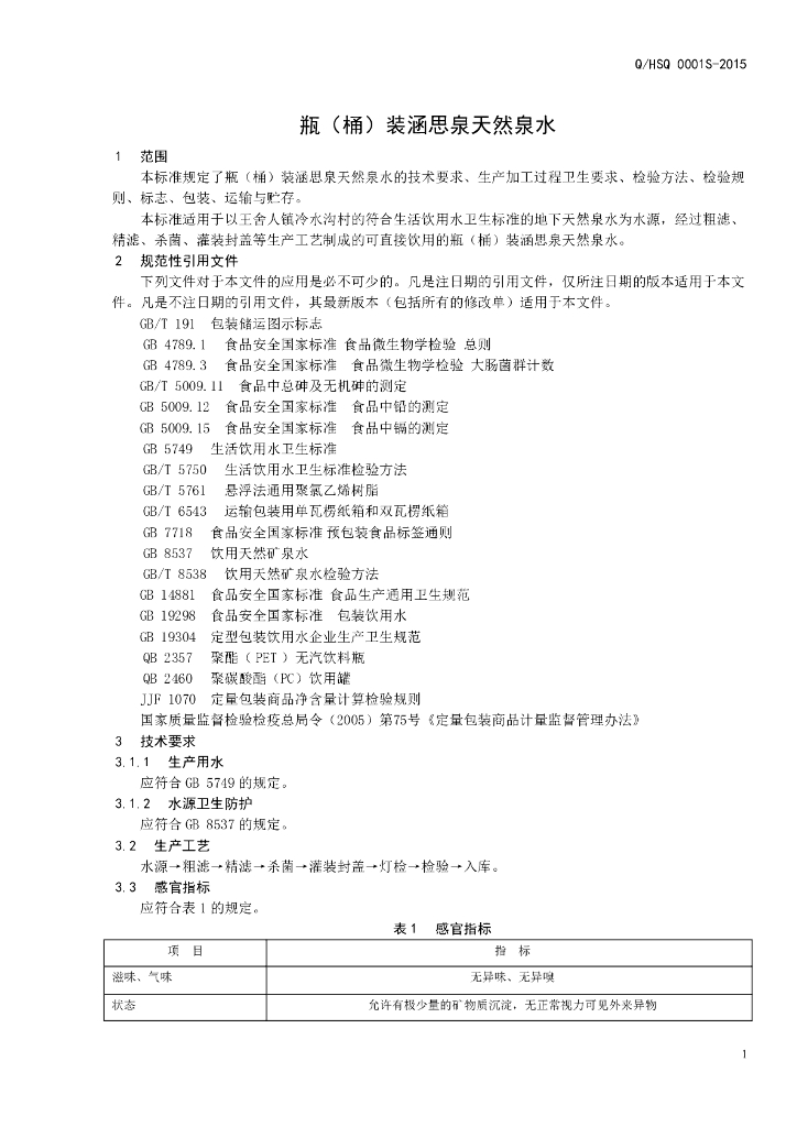 Q/HSQ 0001S-2015 济南涵思泉水业有限公司 瓶(桶)装涵思泉天然泉水