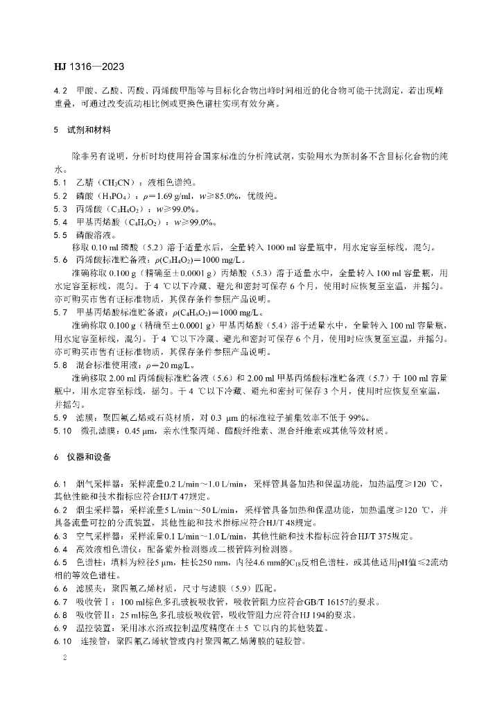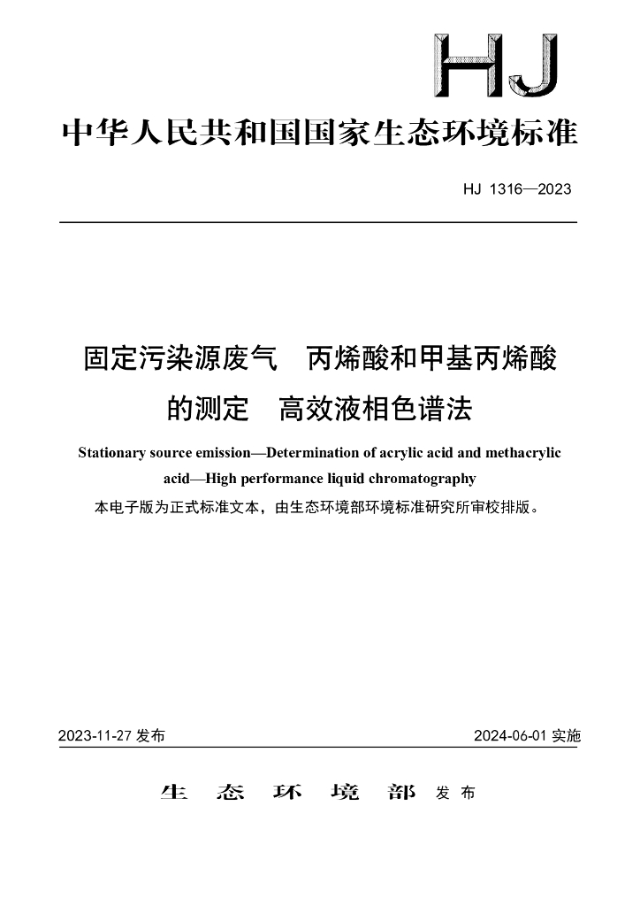 HJ 1316-2023 固定污染源废气 丙烯酸和甲基丙烯酸的测定 高效液相色谱法
