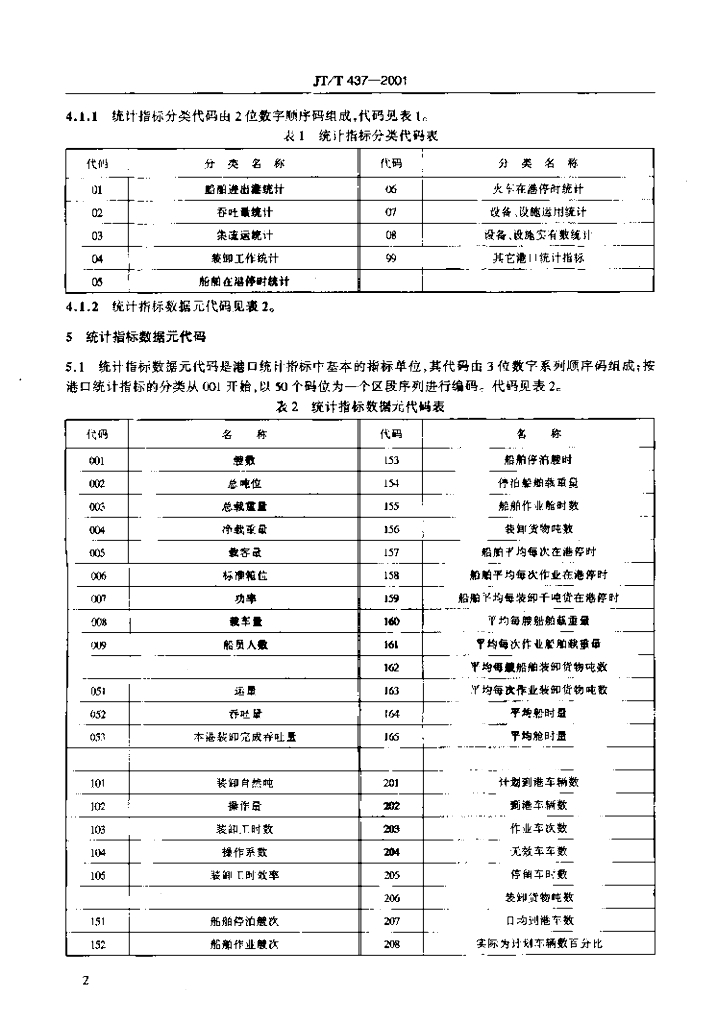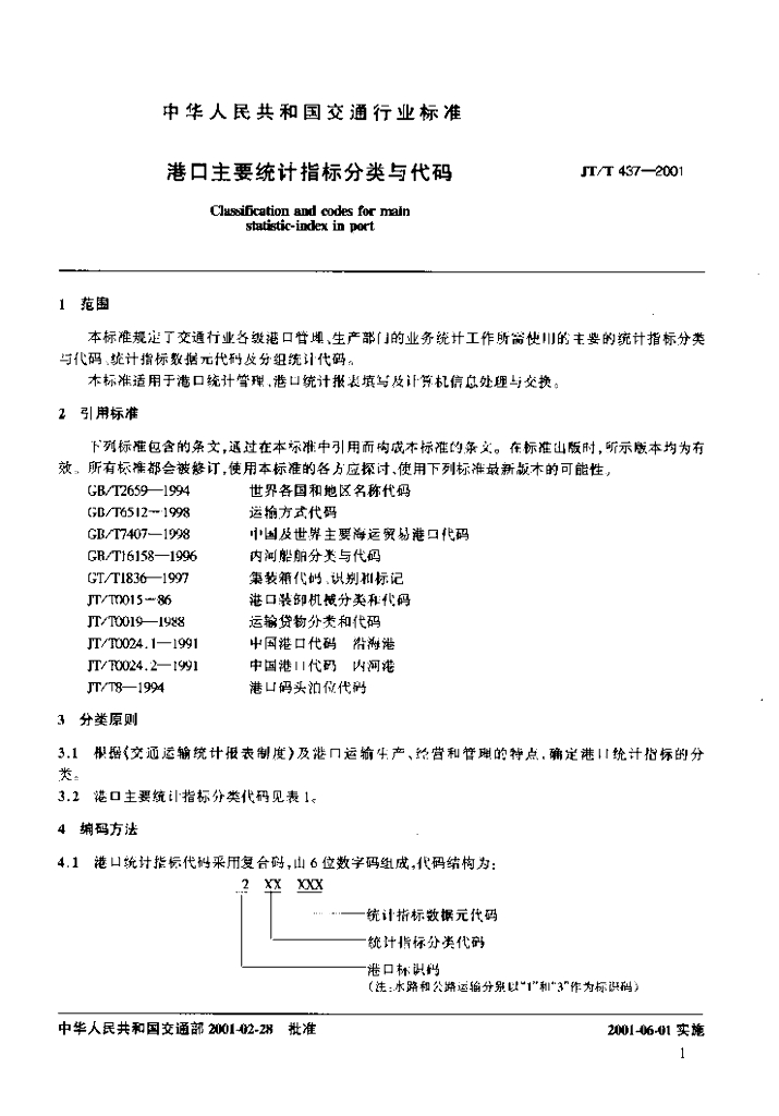 JT/T 437-2001 港口主要统计指标分类与代码