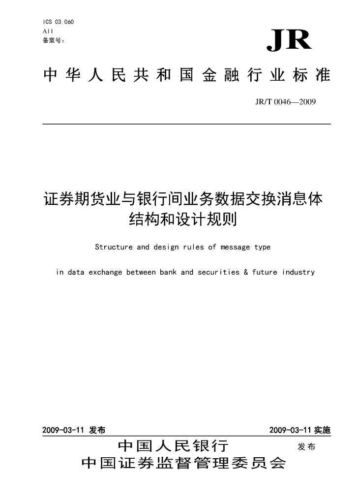 JR/T 0046-2009 证券期货业与银行间业务数据交换消息体结构和设计规则
