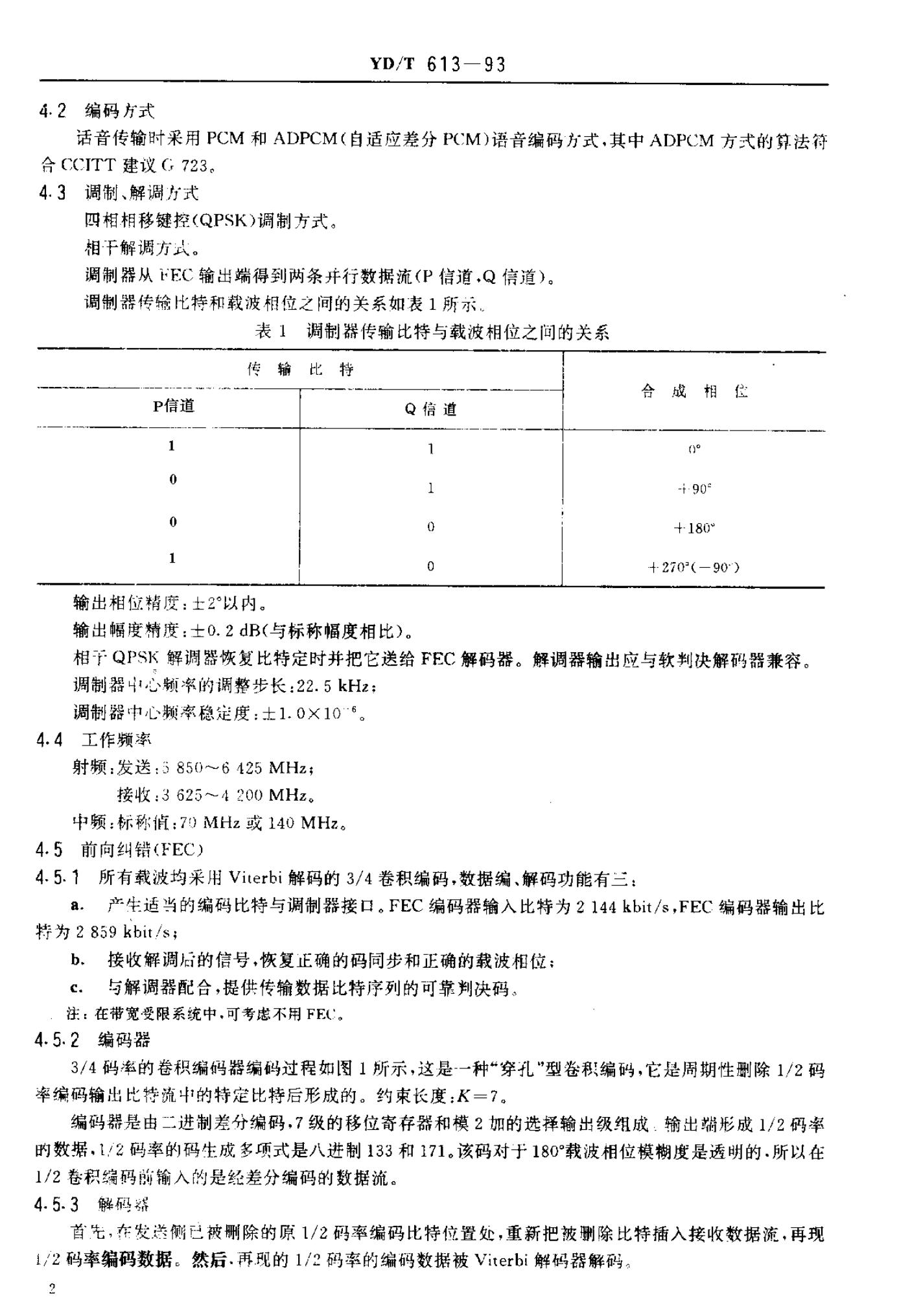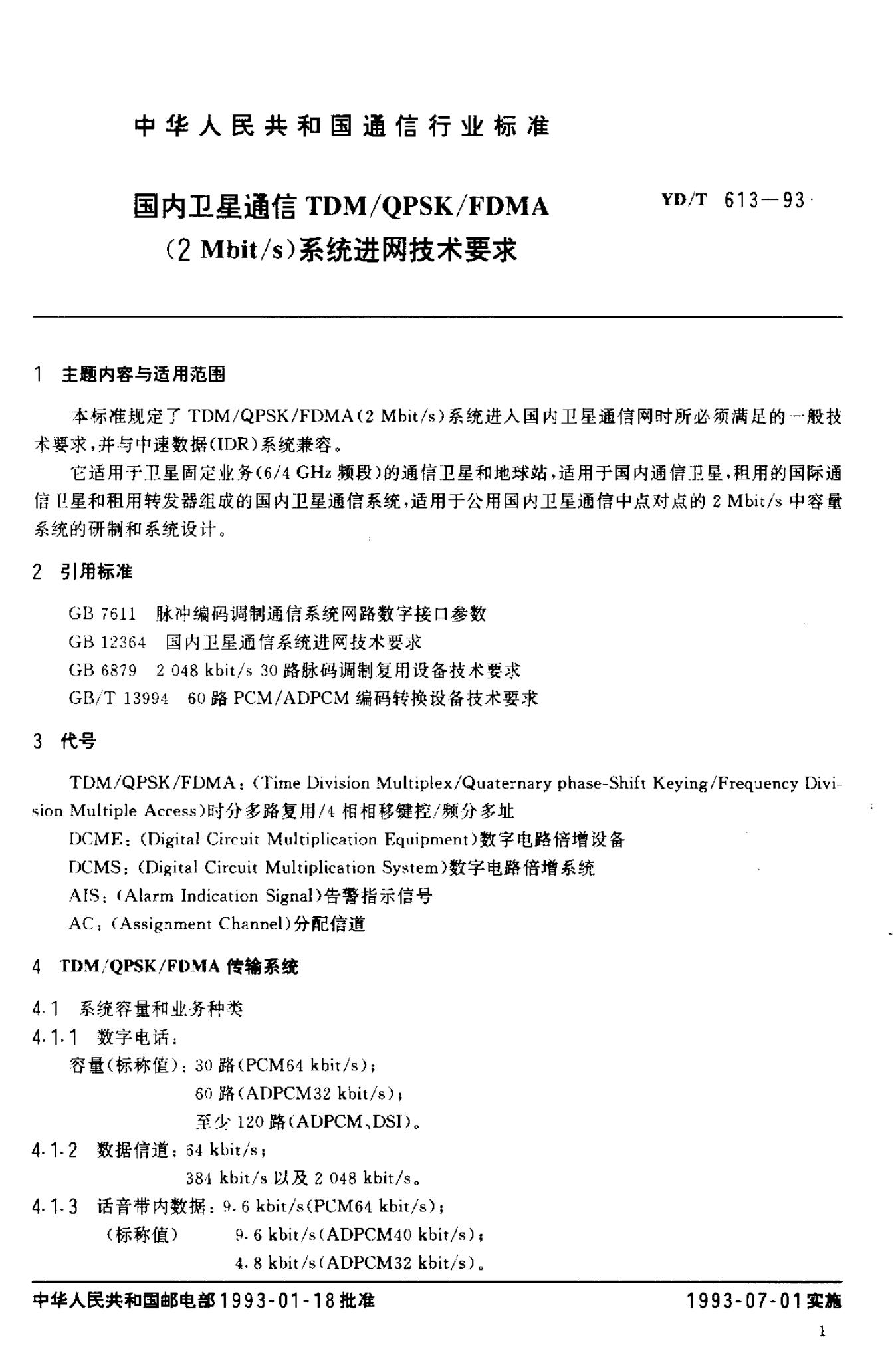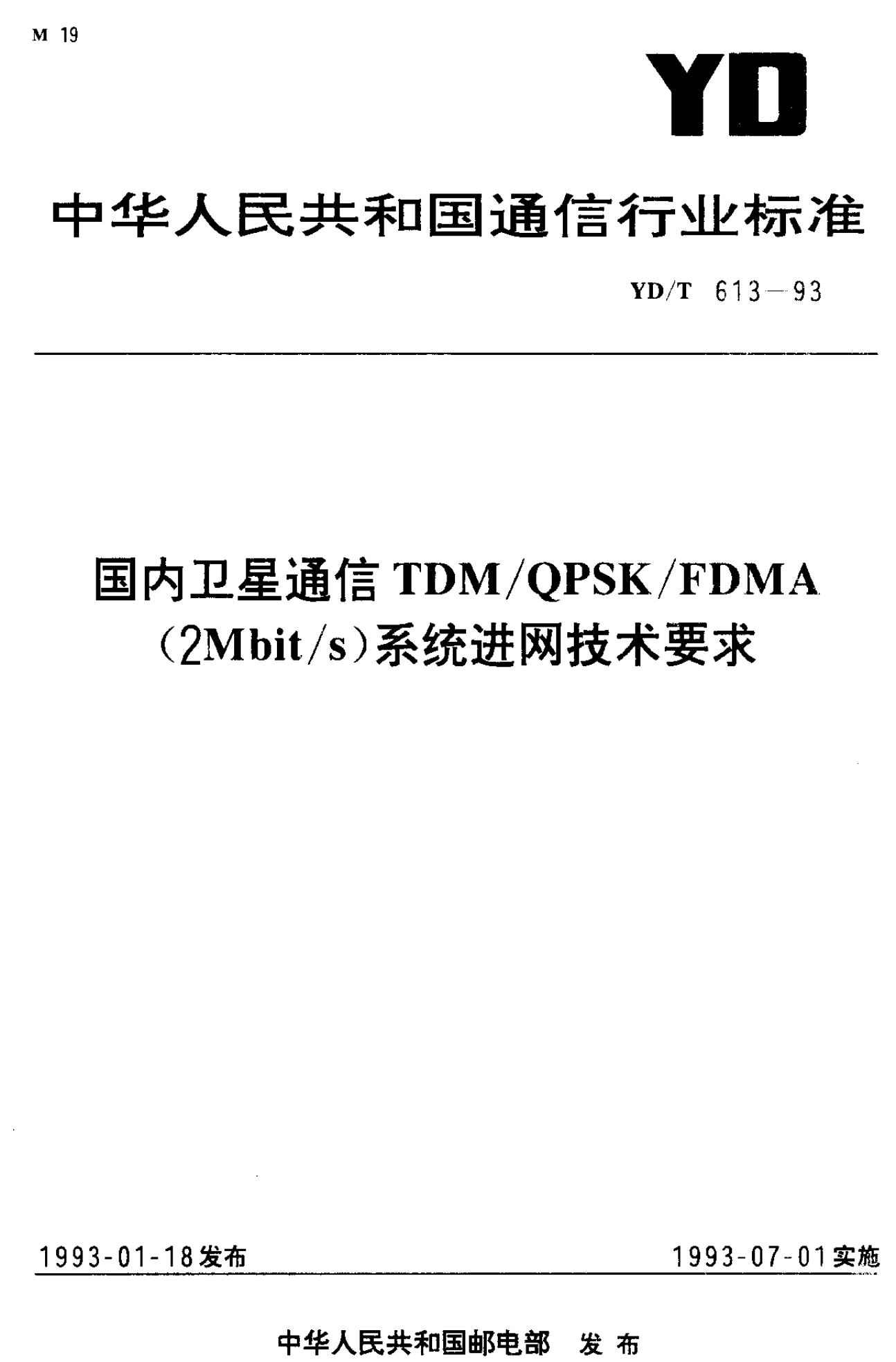 YD/T 613-1993 国内卫星通信TDM/QPSK/FDMA2M bit/s系统进网技术要求