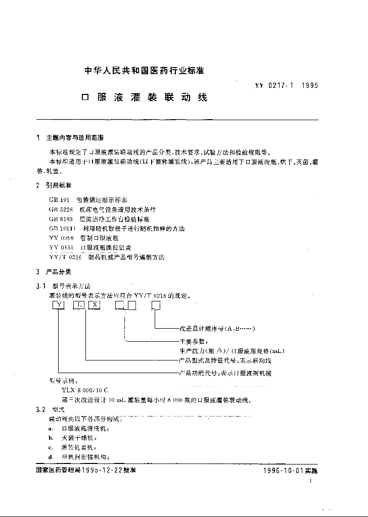 YY 0217.1-1995 口服液灌装联动线