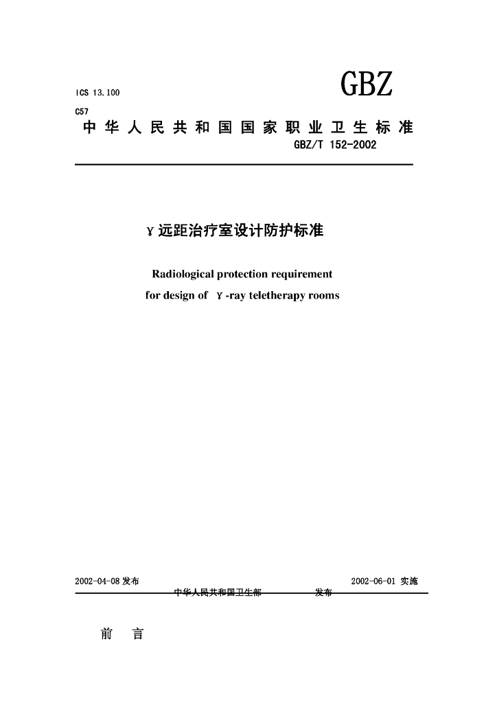 GBZ/T 152-2002 γ远距治疗室设计防护标准