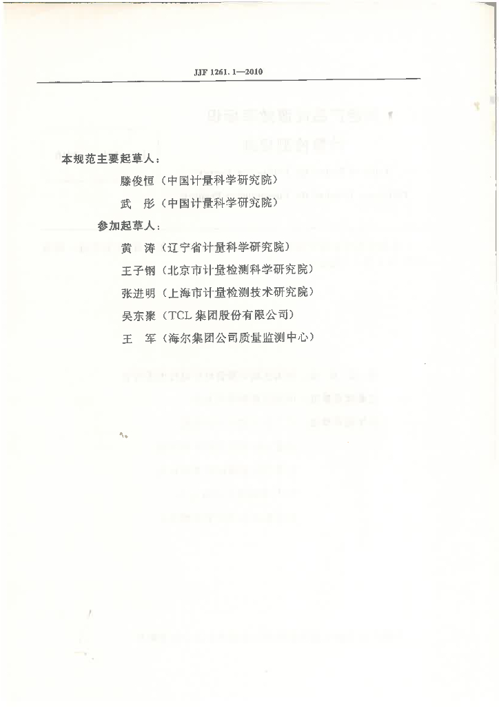 滕俊恒(中国计量科学研究院)、武彤(中国计量科学研究院)、黄涛(辽宁省计量科学研究院)、王子钢(北京市计量检测科学研究院)、张进明(上海市计量检测技术研究院)、吴东聚(TCL集团股份有限公司)、王军(海尔集团公司质量监测中心)