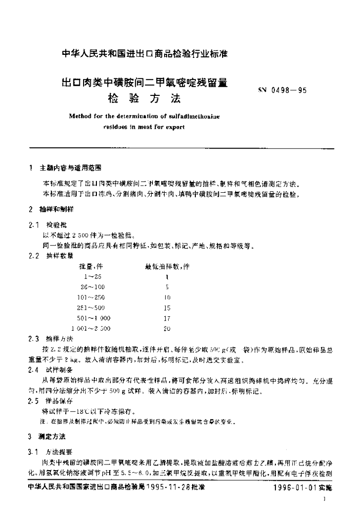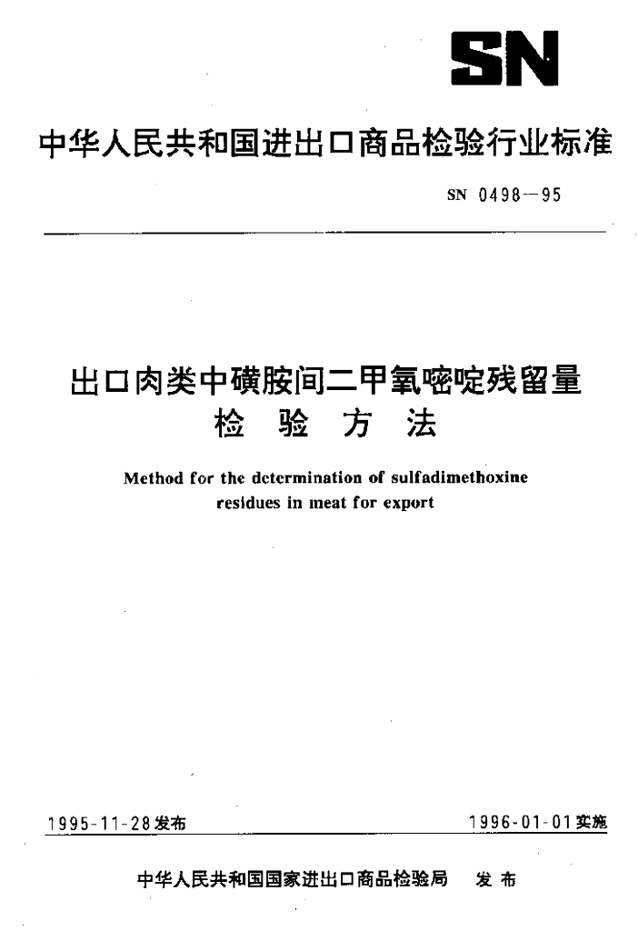 SN 0498-1995 出口肉类中磺胺间二甲氧嘧啶残留量检验方法