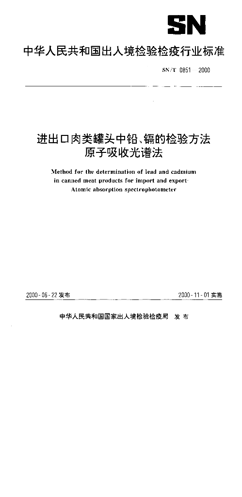 SN/T 0851-2000 进出口肉类罐头中铅、镉的检验方法原子吸收光谱法