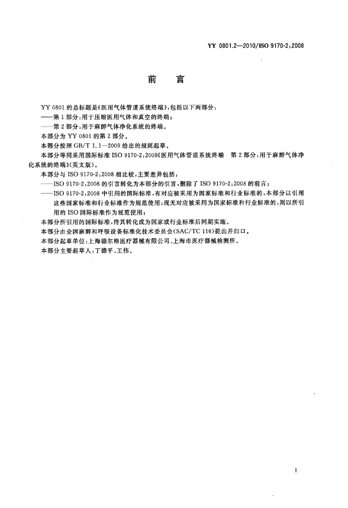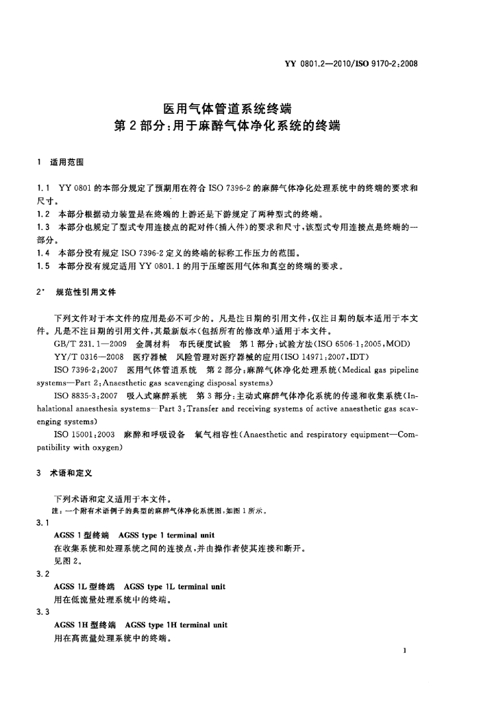 YY 0801.2-2010/ISO 9170-2:2008 医用气体管道系统终端 第2部分:用于麻醉气体净化系统的终端