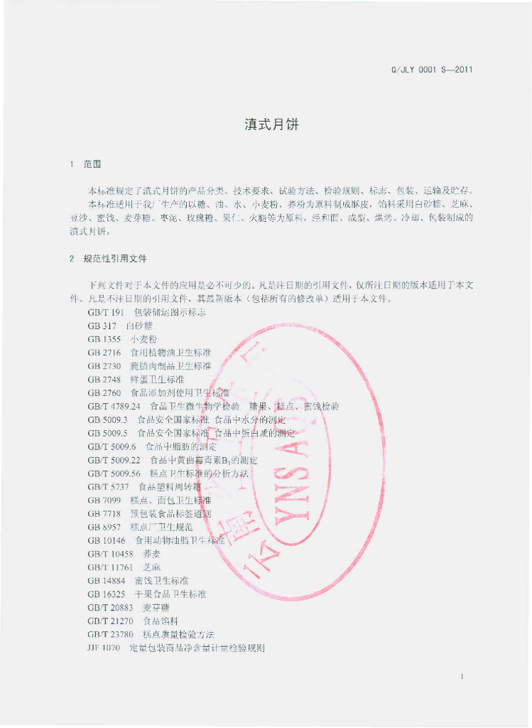 Q/JLY 0001S-2011 滇式月饼