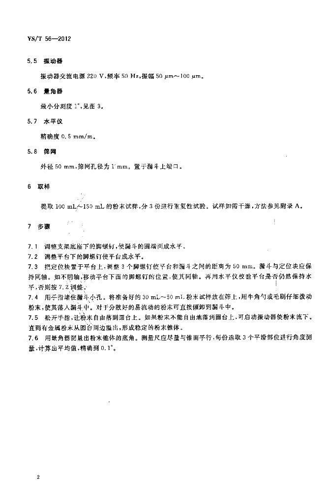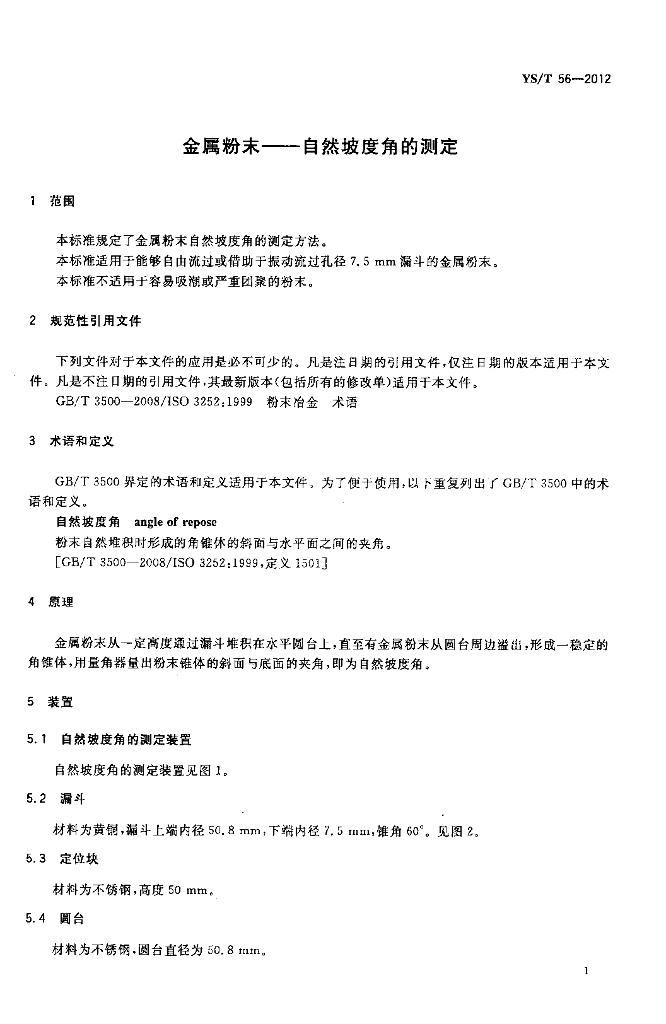 YS/T 56-2012 金属粉末-自然坡度角的测定