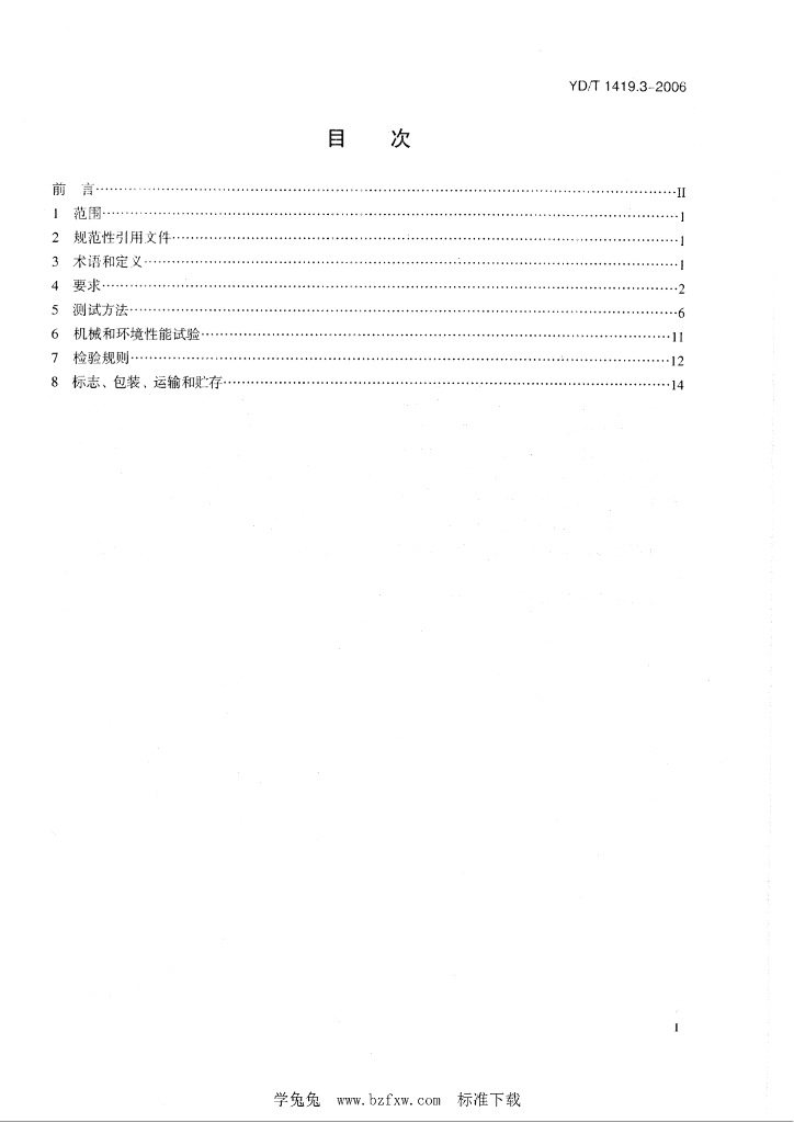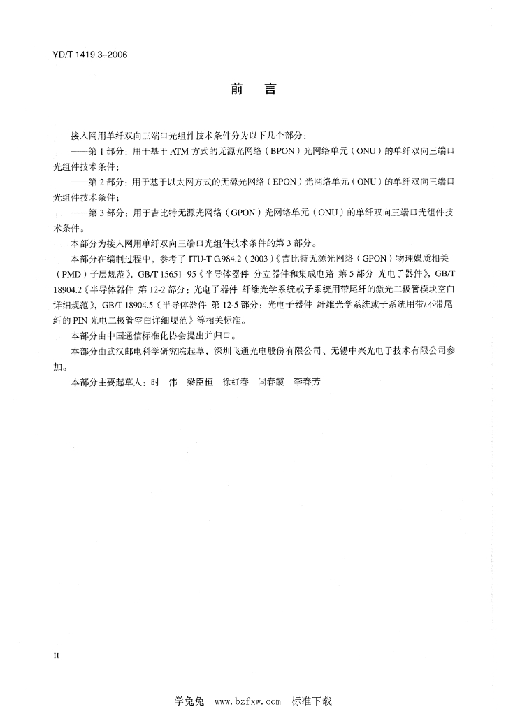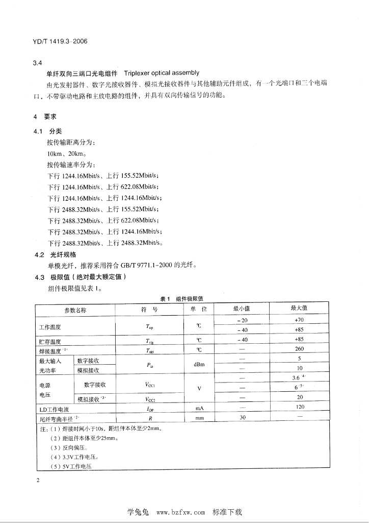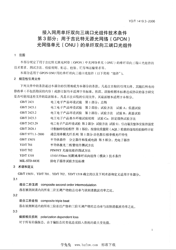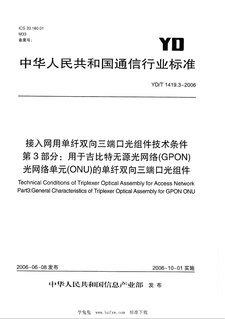 YD/T 1419.3-2006 接入网用单纤双向三端口光组件技术条件 第3部分:用于吉比特无源光网络(GPON)光网络单(ONU)的单纤双向三端口光组件