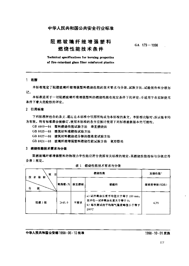 GA 179-1998 阻燃玻璃纤维增强塑料燃烧性能技术条件