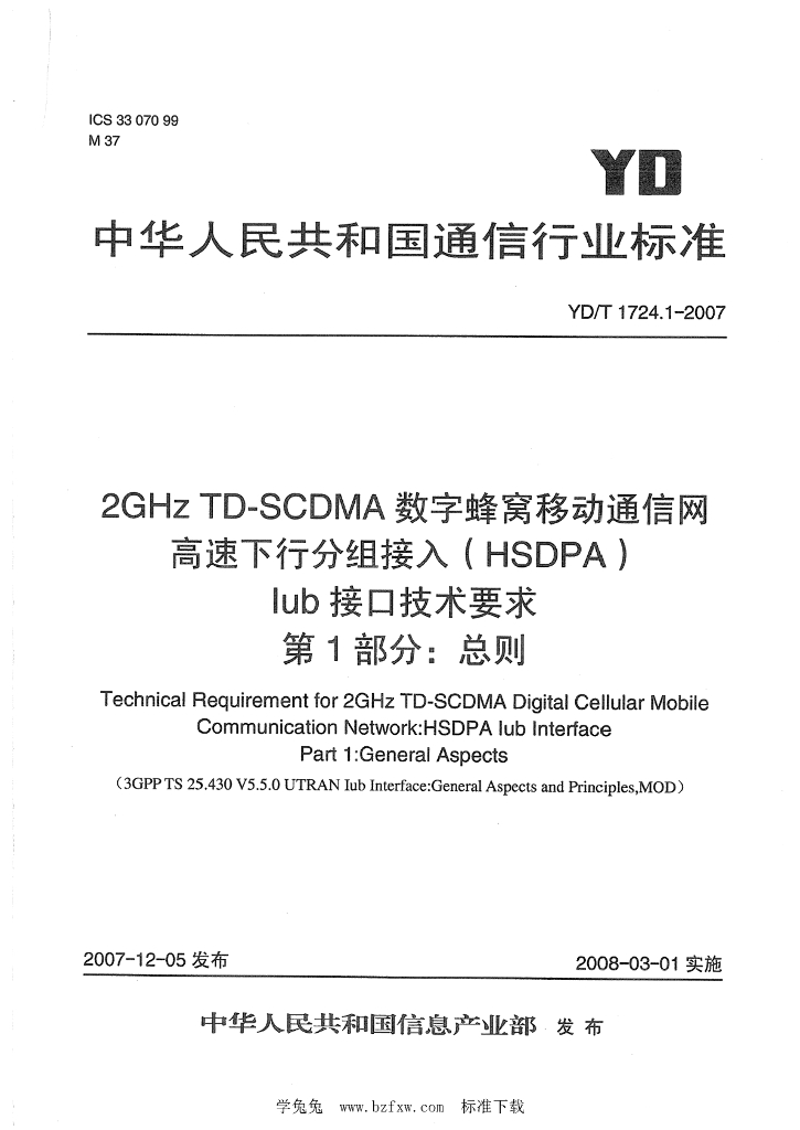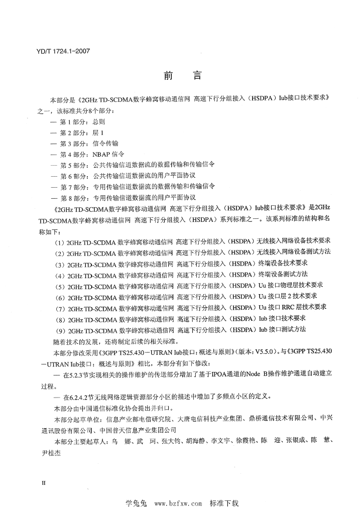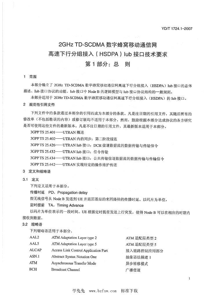 YD/T 1724.1-2007 2GHz TD-SCDMA数字蜂窝移动通信网 高速下行分组接入(HSDPA)Iub接口技术要求 第1部分:总则