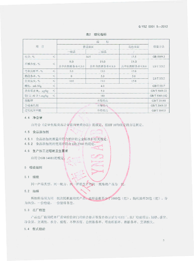 Q/YSZ 0001S-2012 挂面