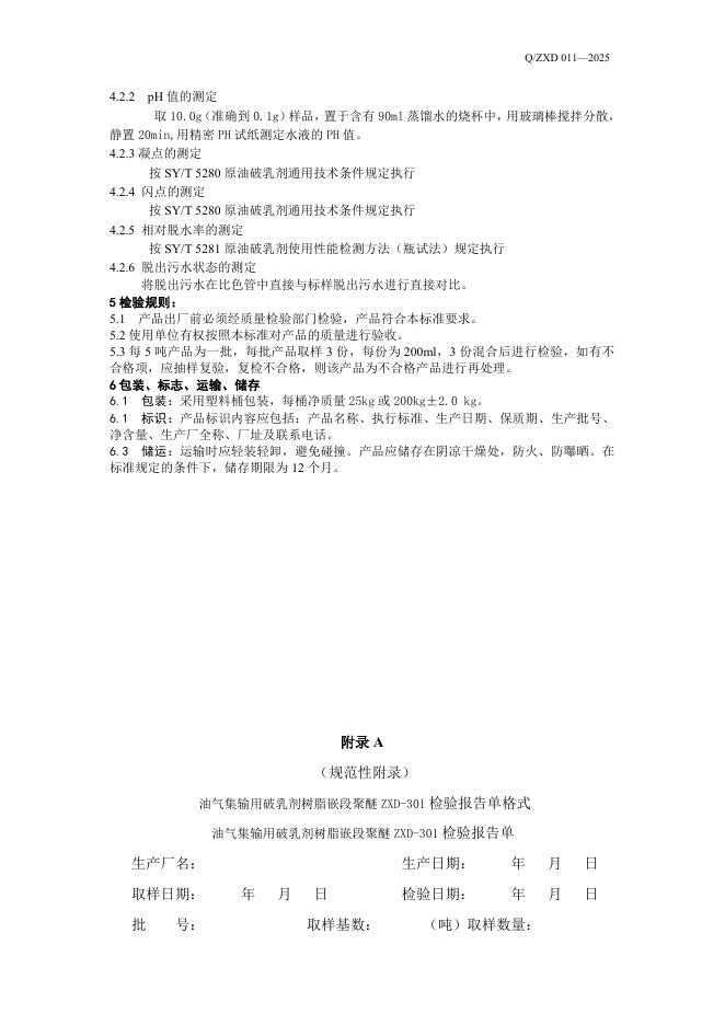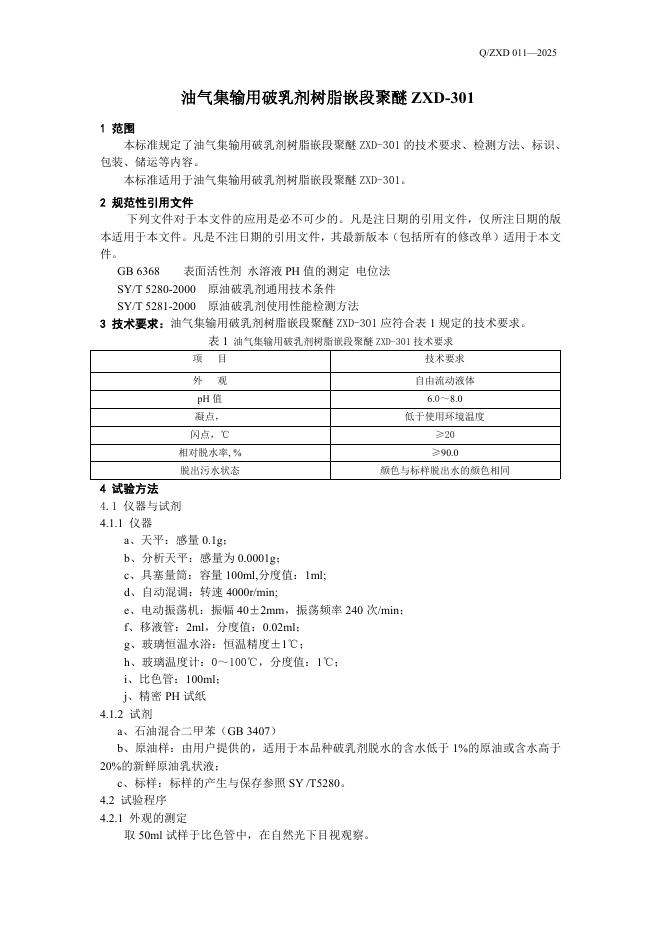 Q/ZXD 011-2025 油气集输用破乳剂树脂嵌段聚醚ZXD-301
