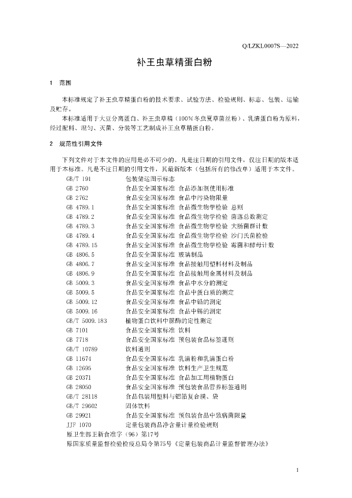 Q/LZKL 0007S-2022 补王虫草精蛋白粉