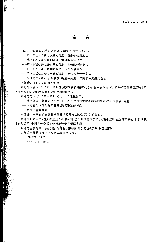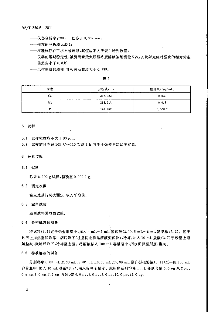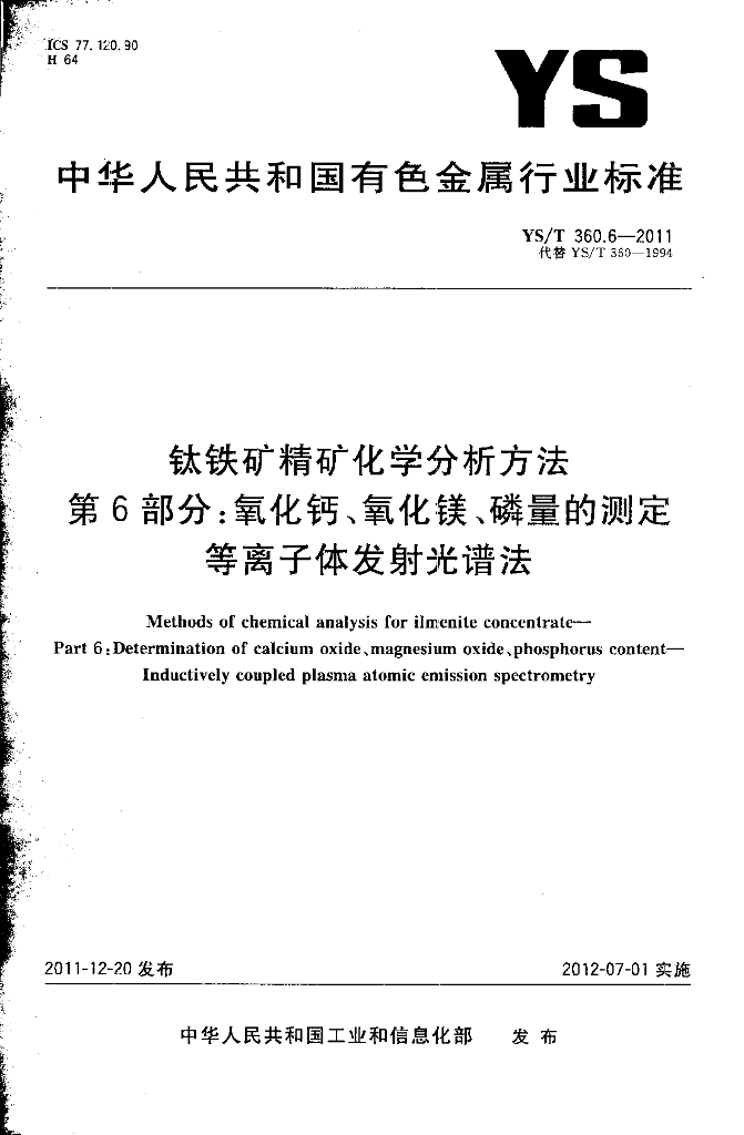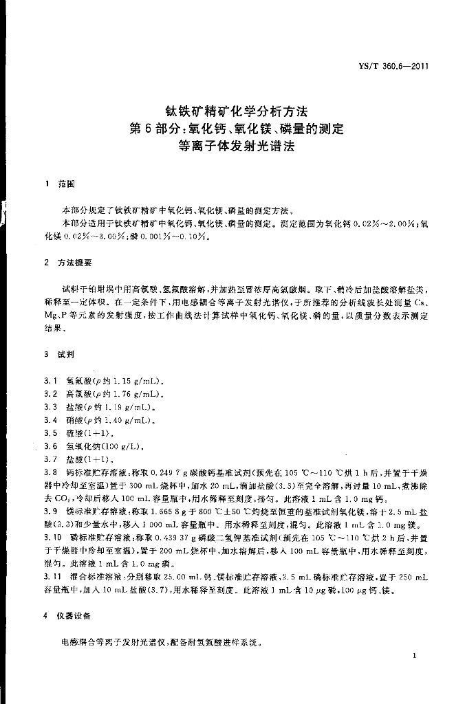 YS/T 360.6-2011 钛铁矿精矿化学分析方法 第6部分:氧化钙、氧化镁、磷量的测定 等离子体发射光谱法
