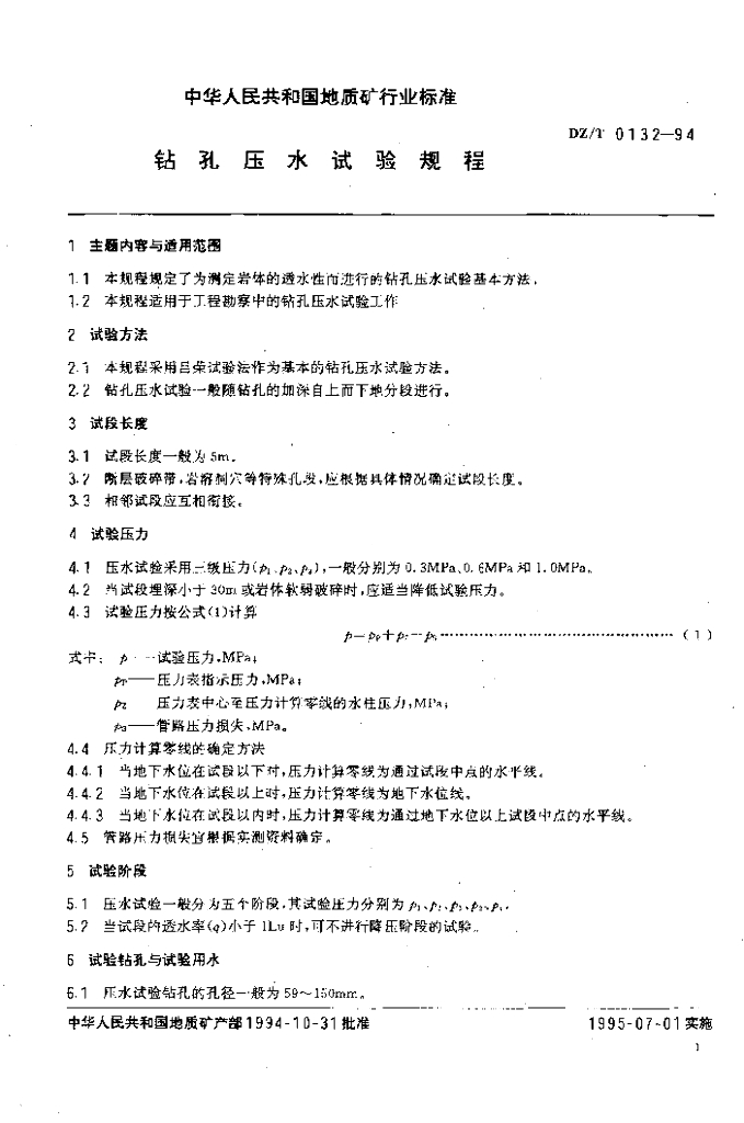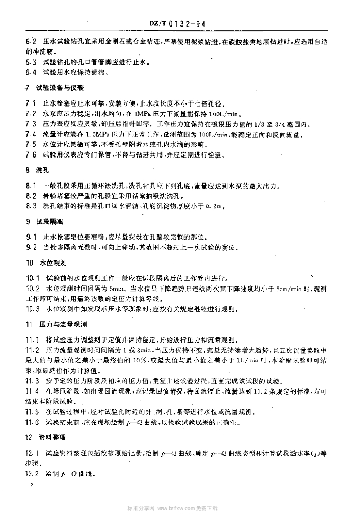 DZ/T 0132-1994 钻孔压水试验规程