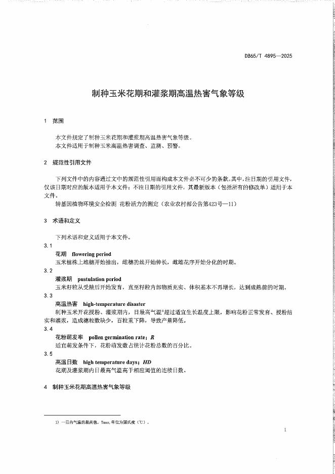 DB65/T 4895-2025 制种玉米花期和灌浆期高温热害气象等级