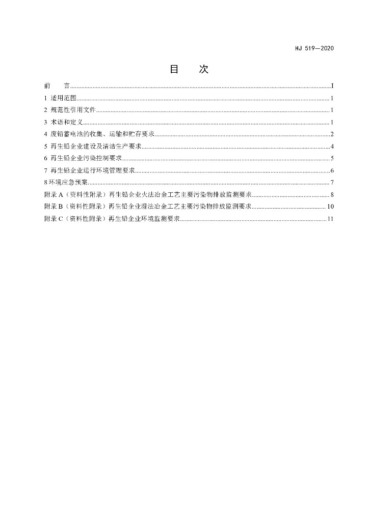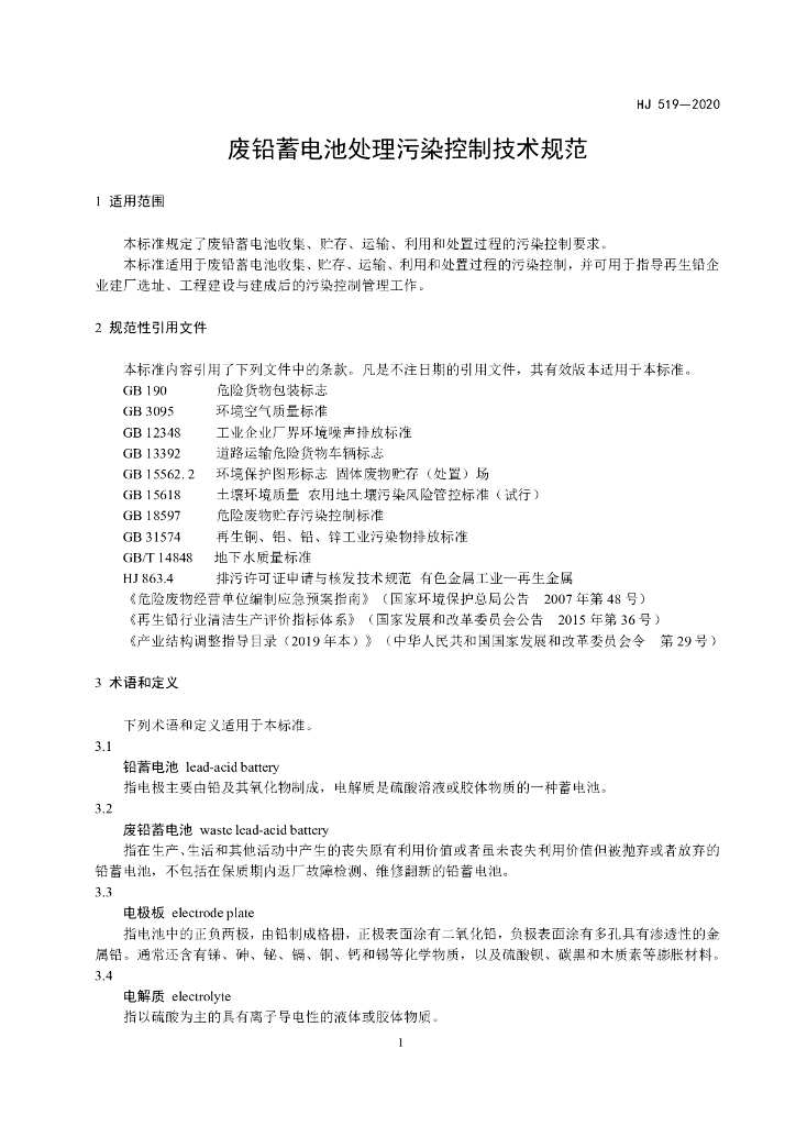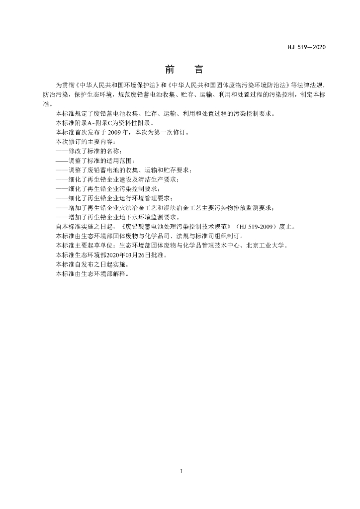 HJ 519-2020 废铅蓄电池处理污染控制技术规范