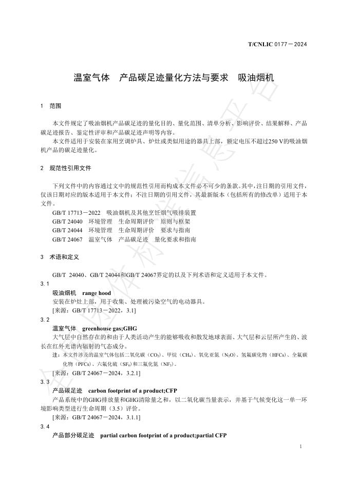 T/CNLIC 0177-2024 温室气体 产品碳足迹量化方法与要求 吸油烟机