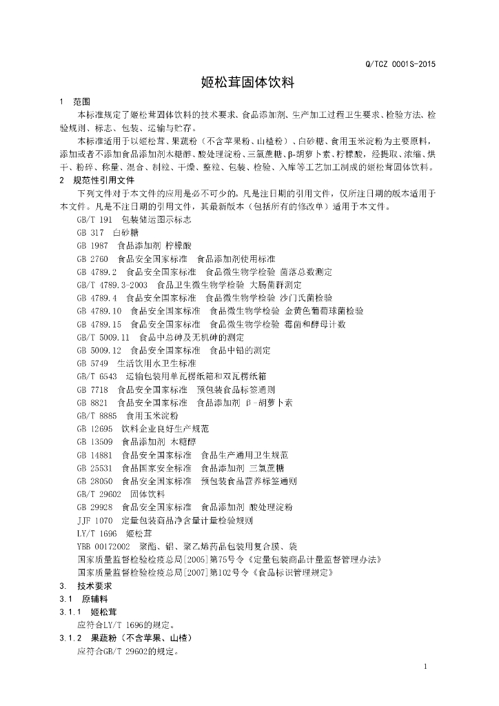 Q/TCZ 0001S-2015 山东新稀宝股份有限公司 姬松茸固体饮料