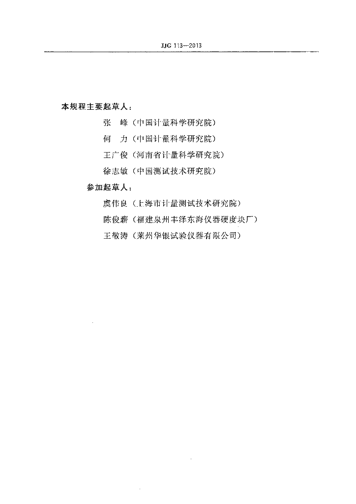 张峰(中国计量科学研究院)、何力(中国计量科学研究院)、王广俊(河南省计量科学研究院)、徐志敏(中国测试技术研究院)、虞伟良(上海市计量测试技术研究院)、陈俊薪(福建泉州丰泽东海仪器硬度块厂)、王敬涛(莱州华银试验仪器有限公司)