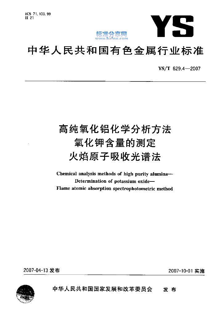 YS/T 629.4-2007 高纯氧化铝化学分析方法 氧化钾含量的测定 火焰原子吸收光谱法