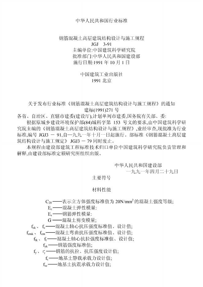 JGJ 3-1991 钢筋混凝土高层建筑结构设计与施工规程