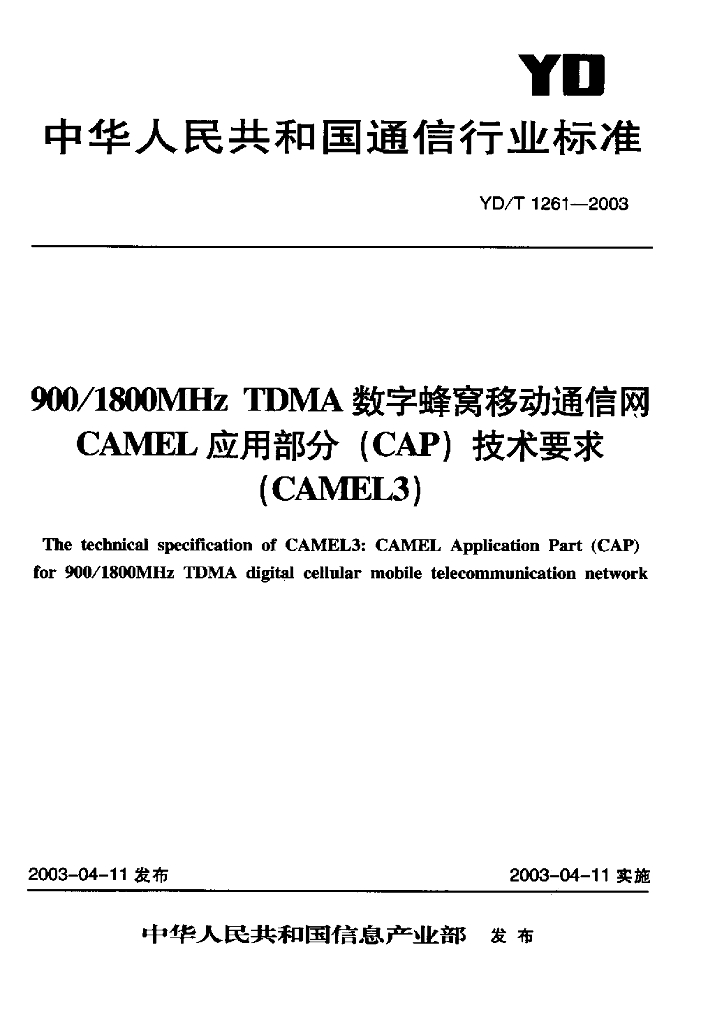 YD/T 1261-2003 900/1800MHz TDMA 数字蜂窝移动通信网 CAMEL 应用部分(CAP)技术要求(CAMEL3)