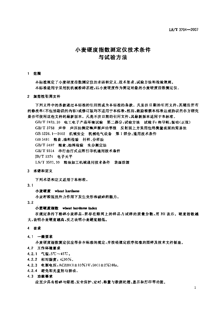 LS/T 3704-2007 小麦硬度指数测定仪技术条件与试验方法