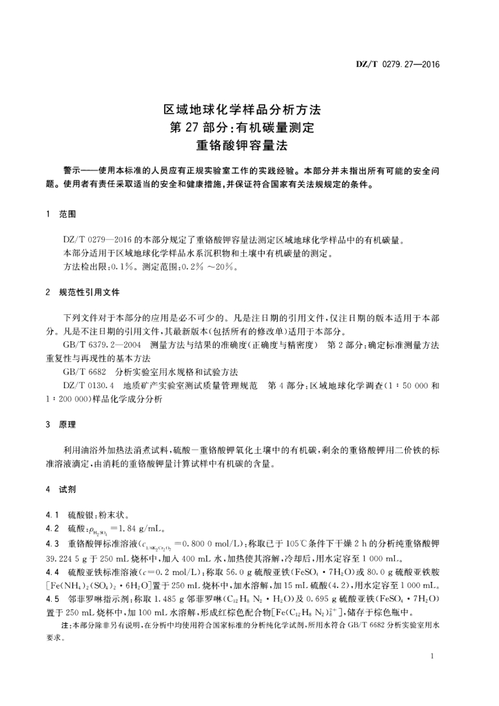 DZ/T 0279.27-2016 区域地球化学样品分析方法 第27部分:有机碳量测定重铬酸钾容量法