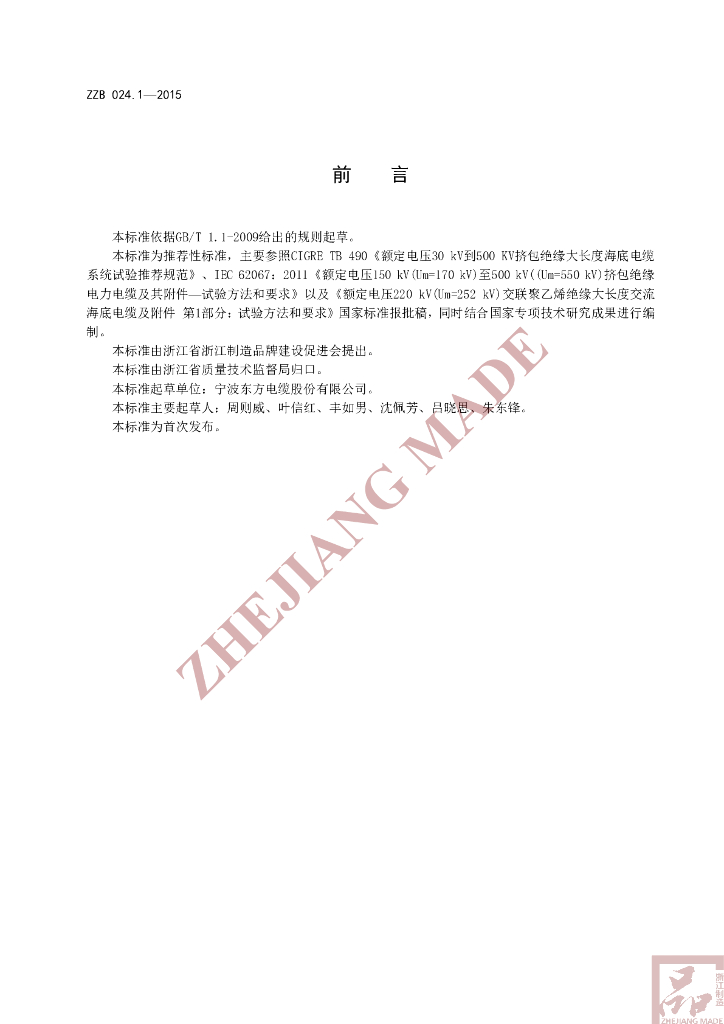 本标准起草单位:宁波东方电缆股份有限公司。