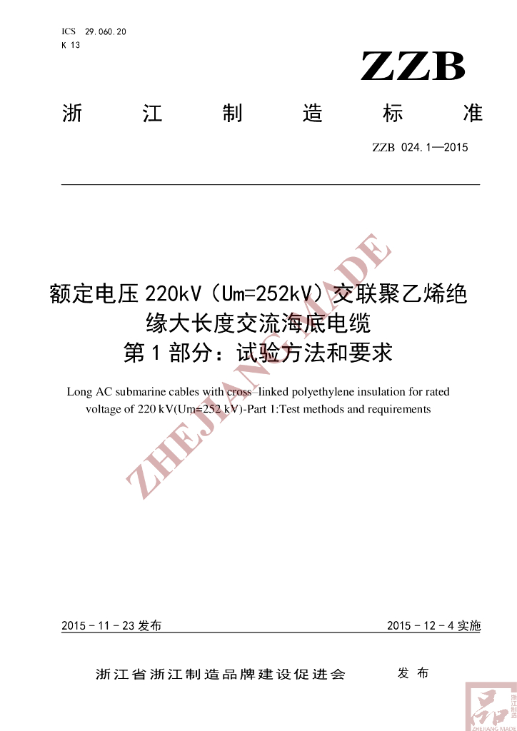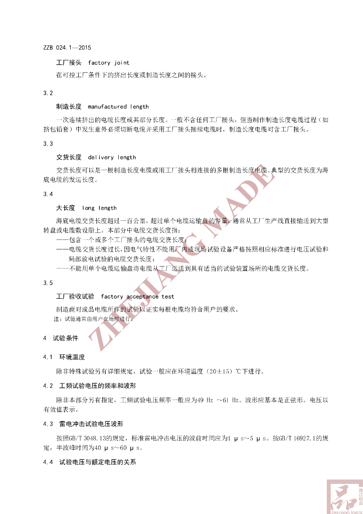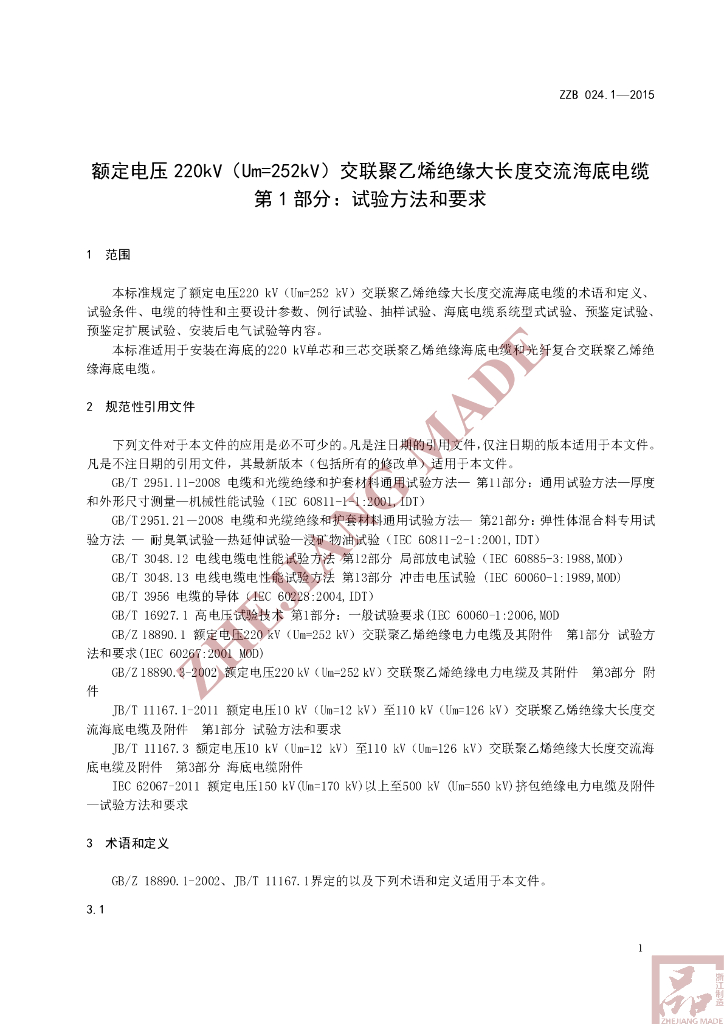 T/ZZB 024.1-2015 额定电压 220kV(Um=252kV)交联聚乙烯绝缘大长度交流海底电缆 第1部分:试验方法和要求