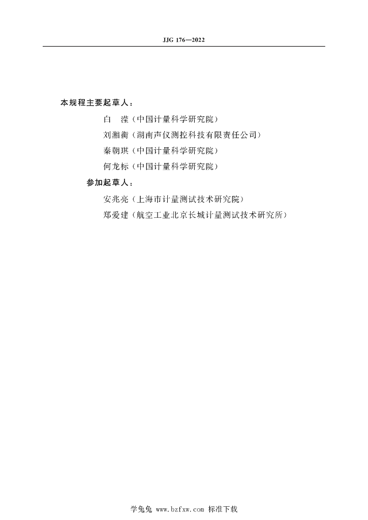 白滢(中国计量科学研究院)、刘湘衡(湖南声仪测控科技有限责任公司)、秦朝琪(中国计量科学研究院)、何龙标(中国计量科学研究院)、安兆亮(上海市计量测试技术研究院)、郑爱建(航空工业北京长城计量测试技术研究所)