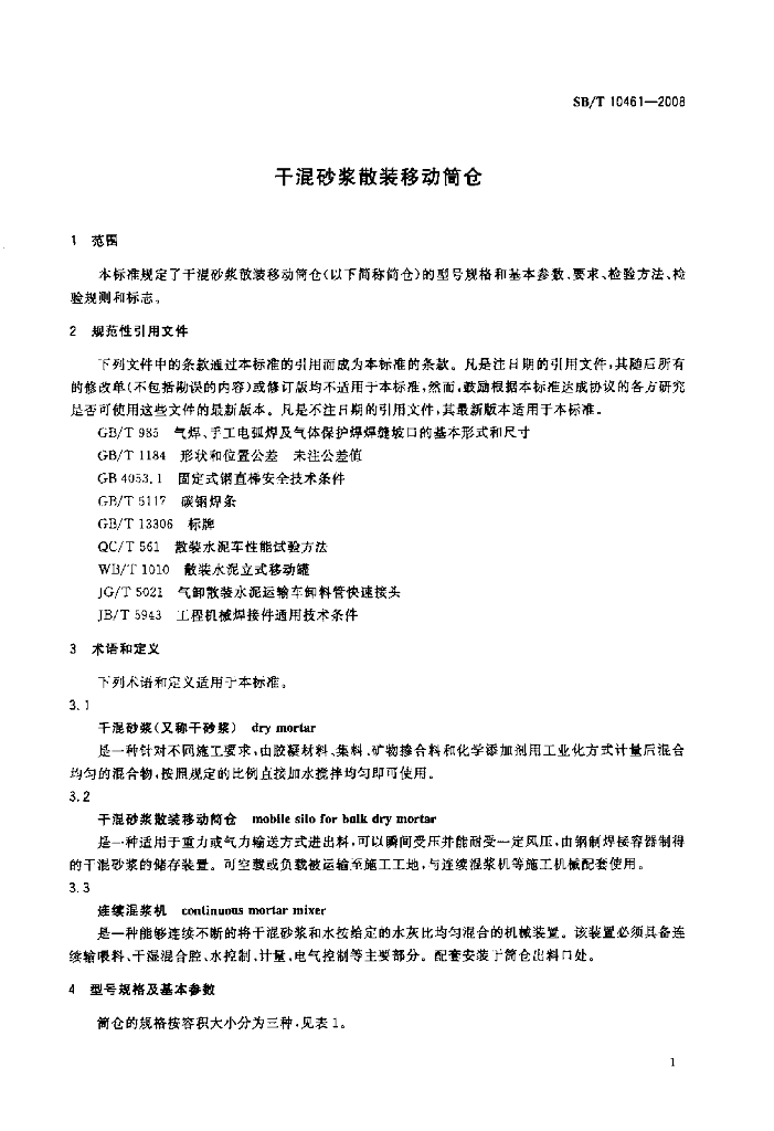 SB/T 10461-2008 干混砂浆散装移动简仓