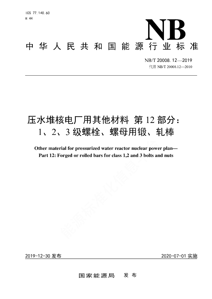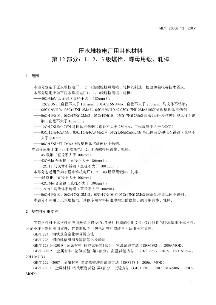 NB/T 20008.12-2019 压水堆核电厂用其他材料 第12部分:1、2、3级螺栓、螺母用锻、轧棒