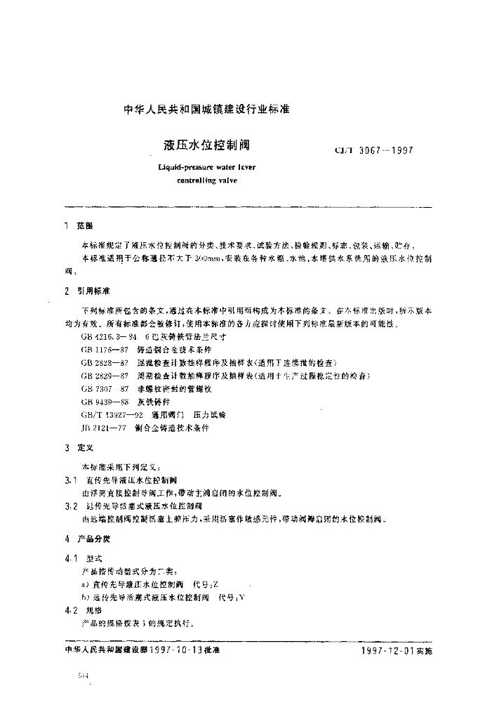 CJ/T 3067-1997 液压水位控制阀