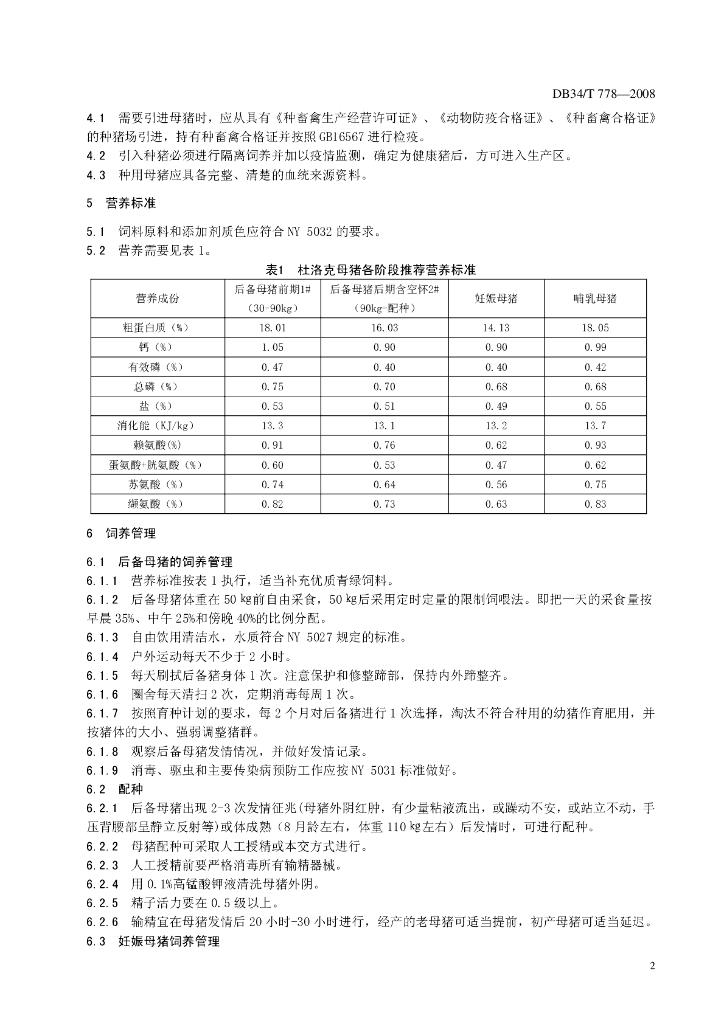 DB34/T 778-2008 美系杜洛克种母猪饲养管理技术规程