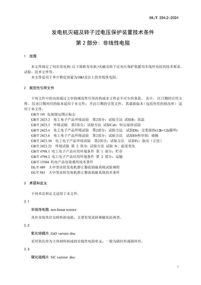 DL/T 294.2-2024 发电机灭磁及转子过电压保护装置技术条件 第2部分:非线性电阻