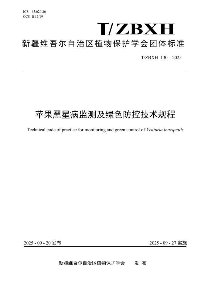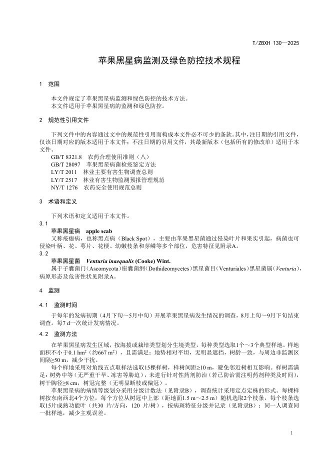 T/ZBXH 130-2025 苹果黑星病监测及绿色防控技术规程