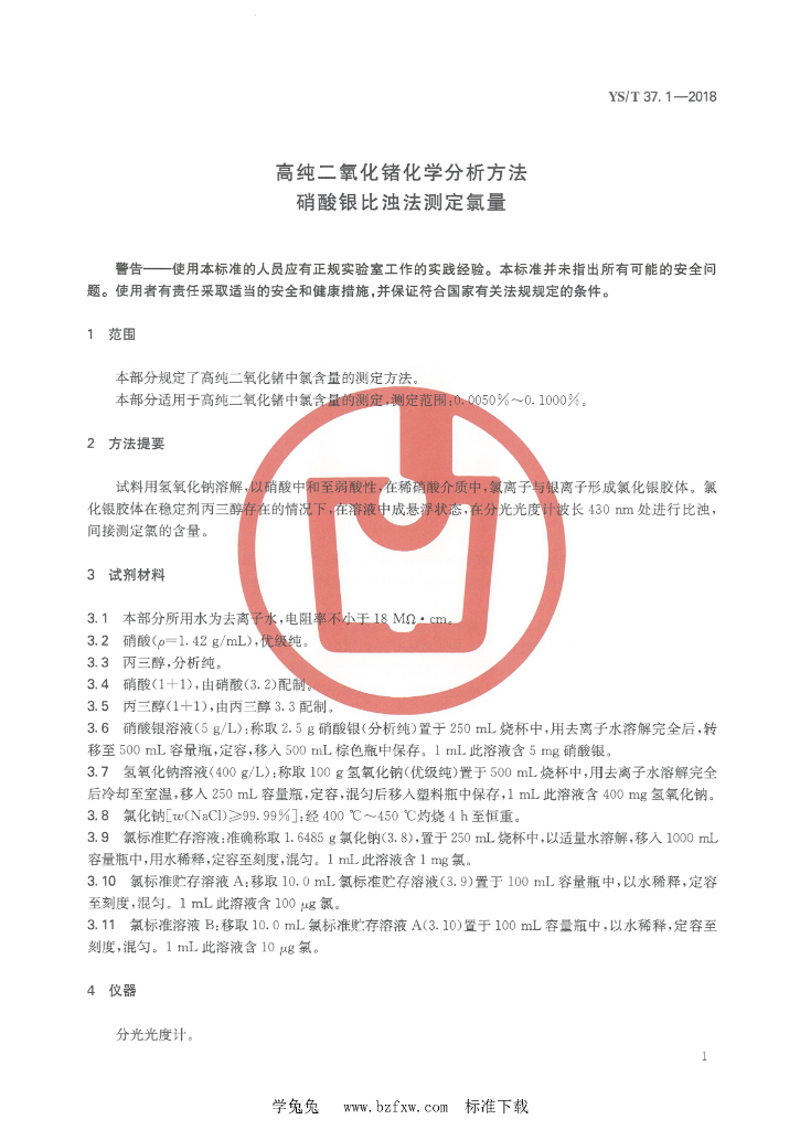 YS/T 37.1-2018 高纯二氧化锗化学分析方法 硝酸银比浊法测定氯量
