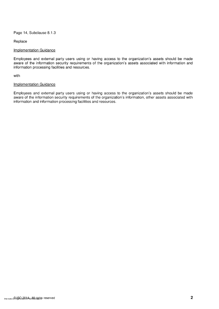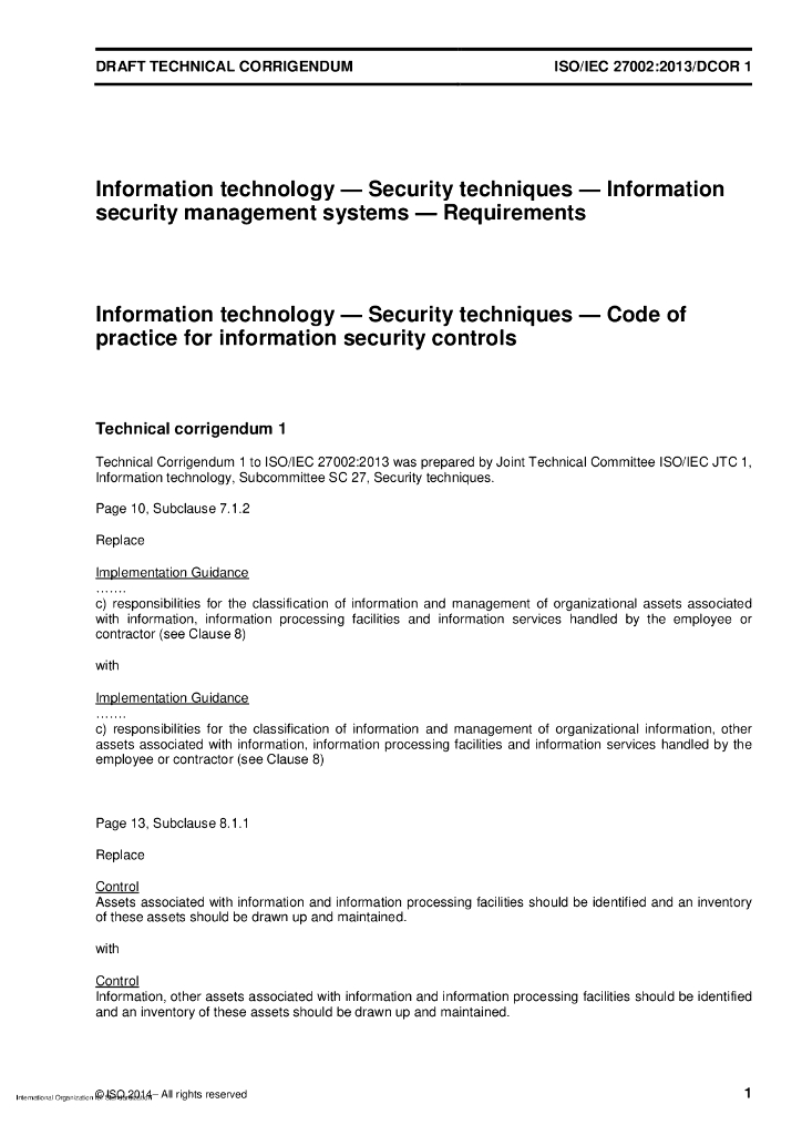 ISO/IEC 27002-2013/Cor 1-2014 勘误表1:信息技术、安全技术、实施规范的信息安全控制