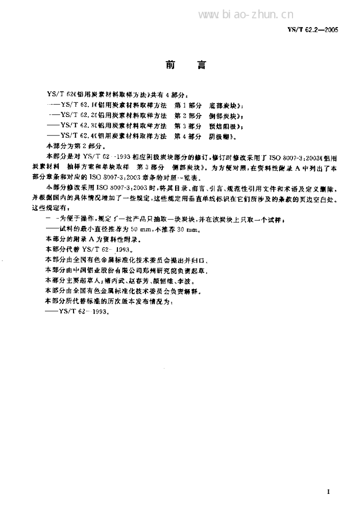 YS/T 62.2-2005 铝用炭素材料取样方法 第2部分 侧部炭块