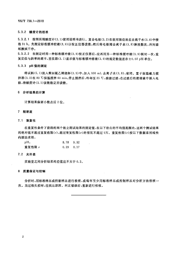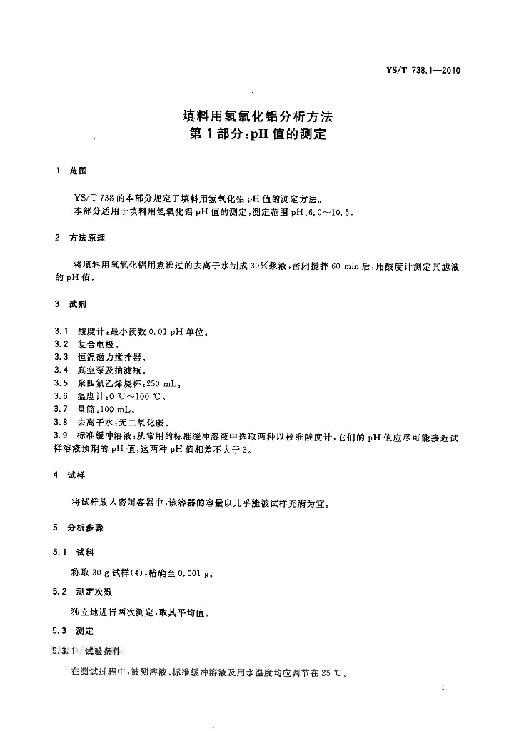 YS/T 738.1-2010 填料用氢氧化铝分析方法 第1部分:pH值的测定