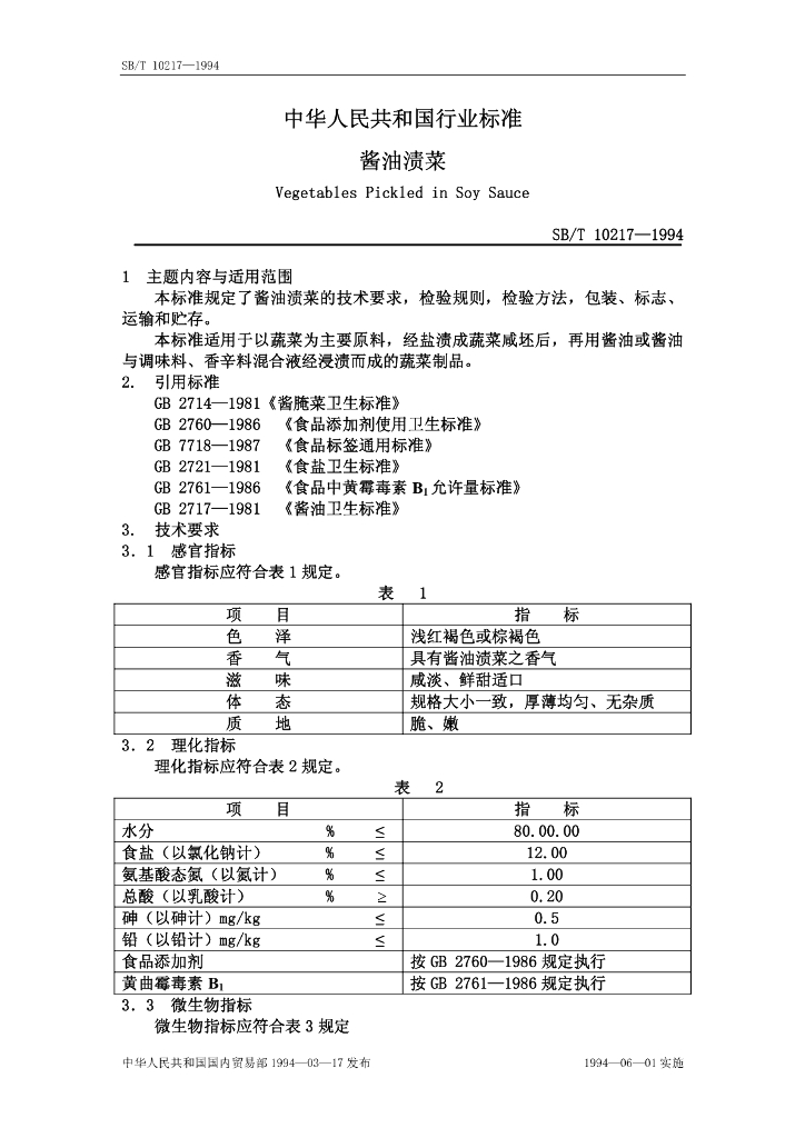 SB/T 10217-1994 酱油渍菜