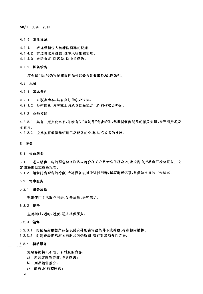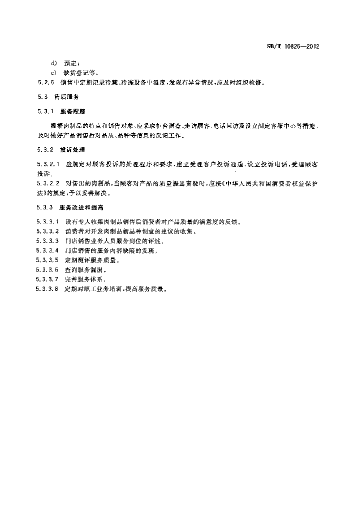 SB/T 10826-2012 加工食品销售服务要求 肉制品